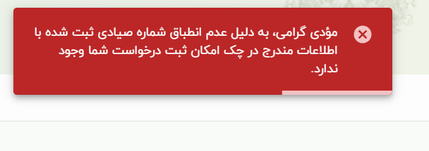 وقتتون بخير . موقعي که ميخوام درخواست افزايش سقف مجاز رو در سامانه موديان بدم با خطا مواجه ميشم. چک هم به درستي مطابق مشخصات گفته شده در سايت موديان ثبت شده . در اخر ميخوام ثبت درخواست رو بزنم اين خطا رو ميده که به دليل عدم انطباق شماره صيادي ثبت شده با اطلاعات مندرج در چک امکان ثبت درخواست شما وجود ندارد . امکانش هست بفرماييد علتش از کجاست؟ بايد از بانک پيگيري کنم يا اداراه دارايي؟